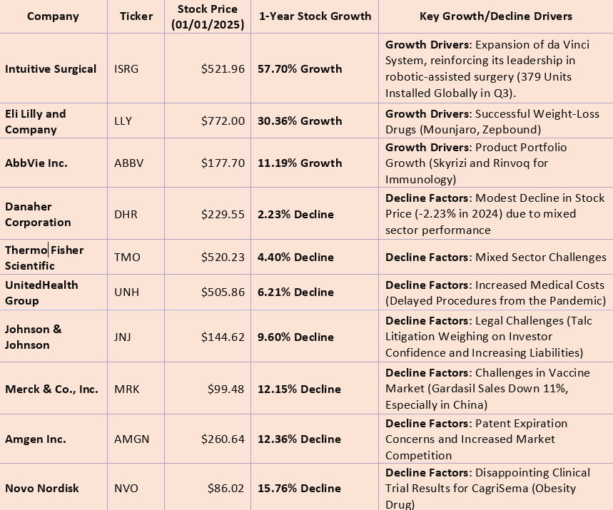 The healthcare sector in 2024 reflected a complex interplay of innovation, market competition, legal challenges, and economic pressures. While some companies emerged as leaders, capitalizing on groundbreaking products and strategic decisions, others faced setbacks, including regulatory hurdles and sector-wide challenges.