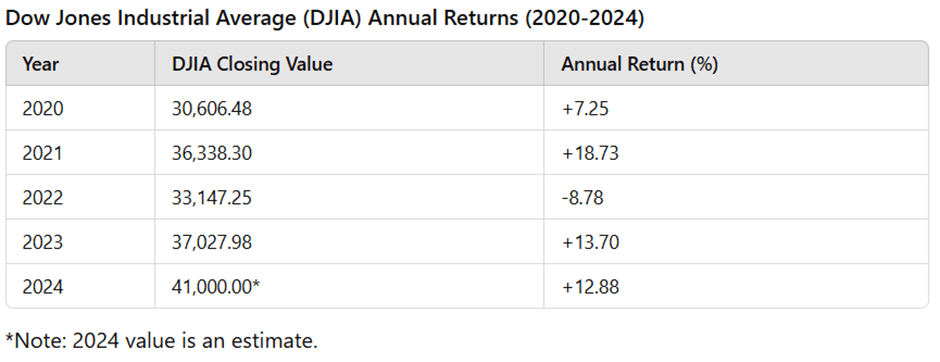 Sources for table (Annual Returns for Dow Jones and S&P 500): DJIA FRED, DJIA | WSJ, Slick Charts, Dow Jones Historical Returns by Year Since 1886