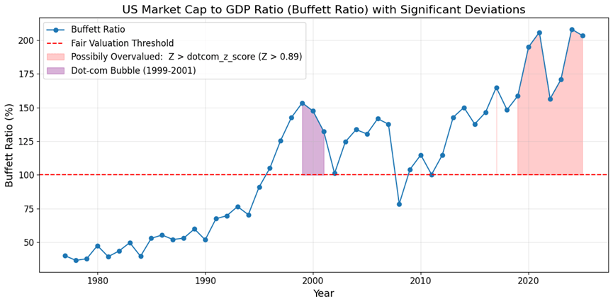 As 2025 unfolds, equity markets are grappling with historic overvaluation and growing economic uncertainties, challenging traditional investment strategies. Metrics such as the Buffett Indicator—tracking the US Market Cap to GDP Ratio—continues to highlight significant market overvaluation. The current ratio levels remain far above the historical fair valuation threshold of 100%, with recent peaks surpassing even the infamous dot-com bubble (Ronsard | Desir Research Group).