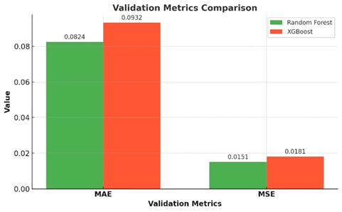 Figure 1: This chart highlights the performance of Random Forest and XGBoost models in terms of Mean Absolute Error (MAE) and Mean Squared Error (MSE). Lower values indicate better performance, with Random Forest slightly outperforming XGBoost in both metrics.