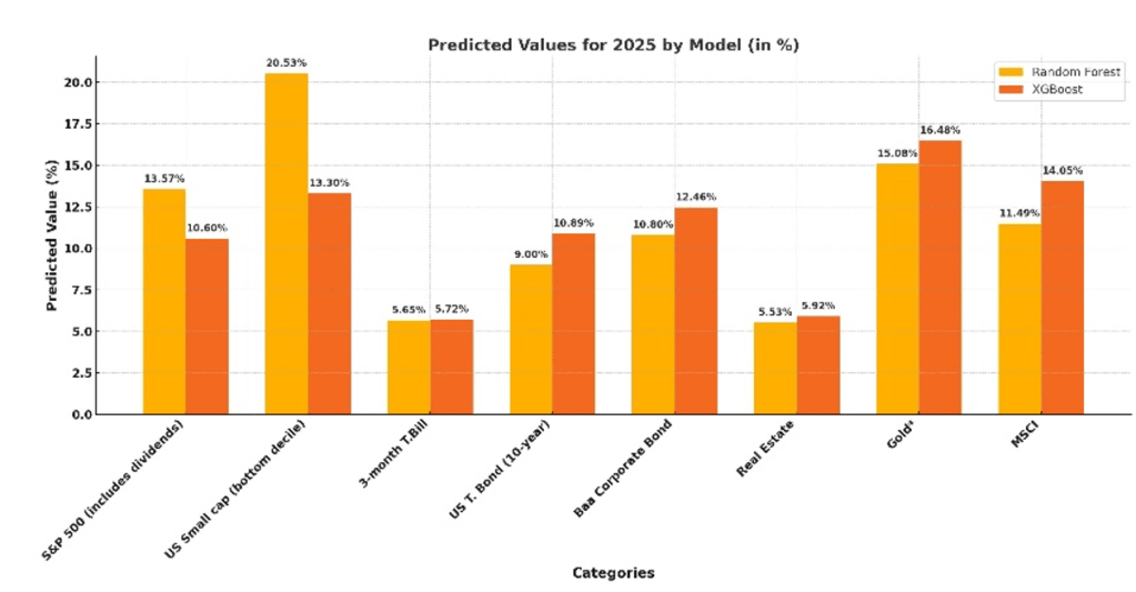 Figure 2: This chart compares the predicted returns (%) for various asset classes in 2025 as forecasted by Random Forest and XGBoost models. The predictions include key categories such as the S&P 500, US Small Cap, Bonds, Real Estate, and Gold, illustrating model-specific differences in performance expectations.
